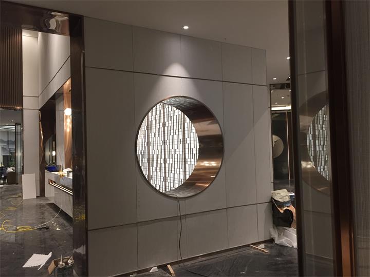 明鉑爾?不銹鋼團隊嚴格安裝施工標準制作不銹鋼屏風(fēng)隔斷,整圓造型,波浪板吊頂制作安裝。